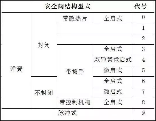 杠桿式安全閥,在類型代號前加G字,數字代號,新標準未作規定。舊標準:1 單桿微啟式,2 單桿全啟式,3 雙桿微啟式,4 雙桿全啟式,6 脈沖式。