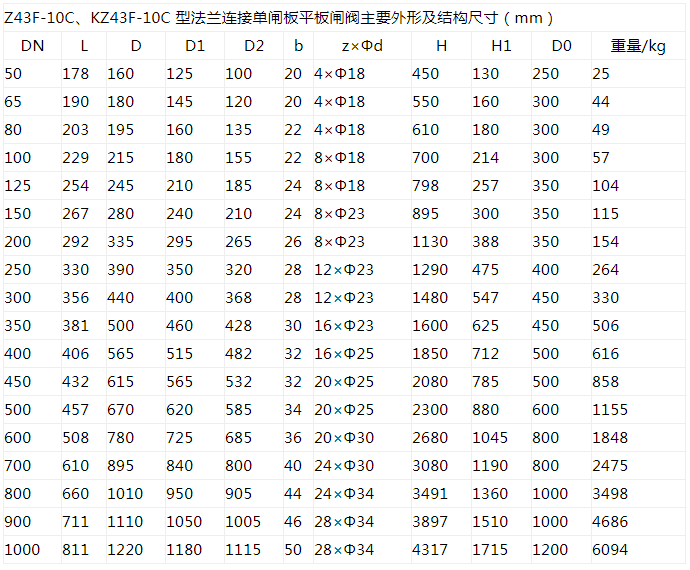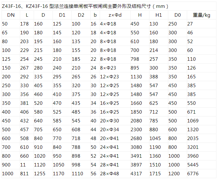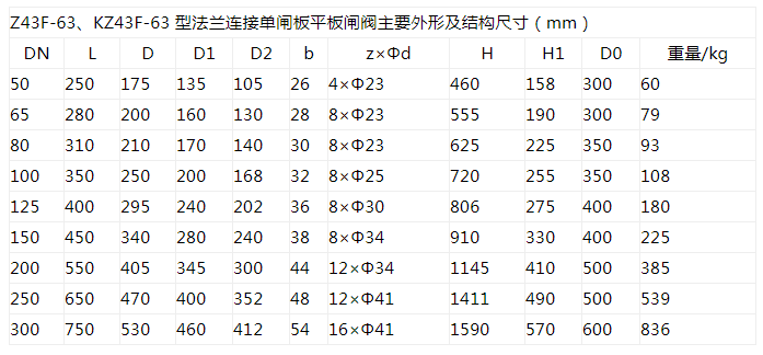 Z43F、KZ43F 型PN10~PN160 法蘭連接單閘板平板閘閥:手動、法蘭連接、明桿平行式剛性單閘板,閥座密封面材料為鉻不銹鋼+聚四氟乙烯,公稱壓力PN16~PN160,閥體材料為碳素鋼(Z43F-10C~160)、抗硫化處理碳素鋼(KZ43F-10C~160)的帶導流孔的平板閘閥。